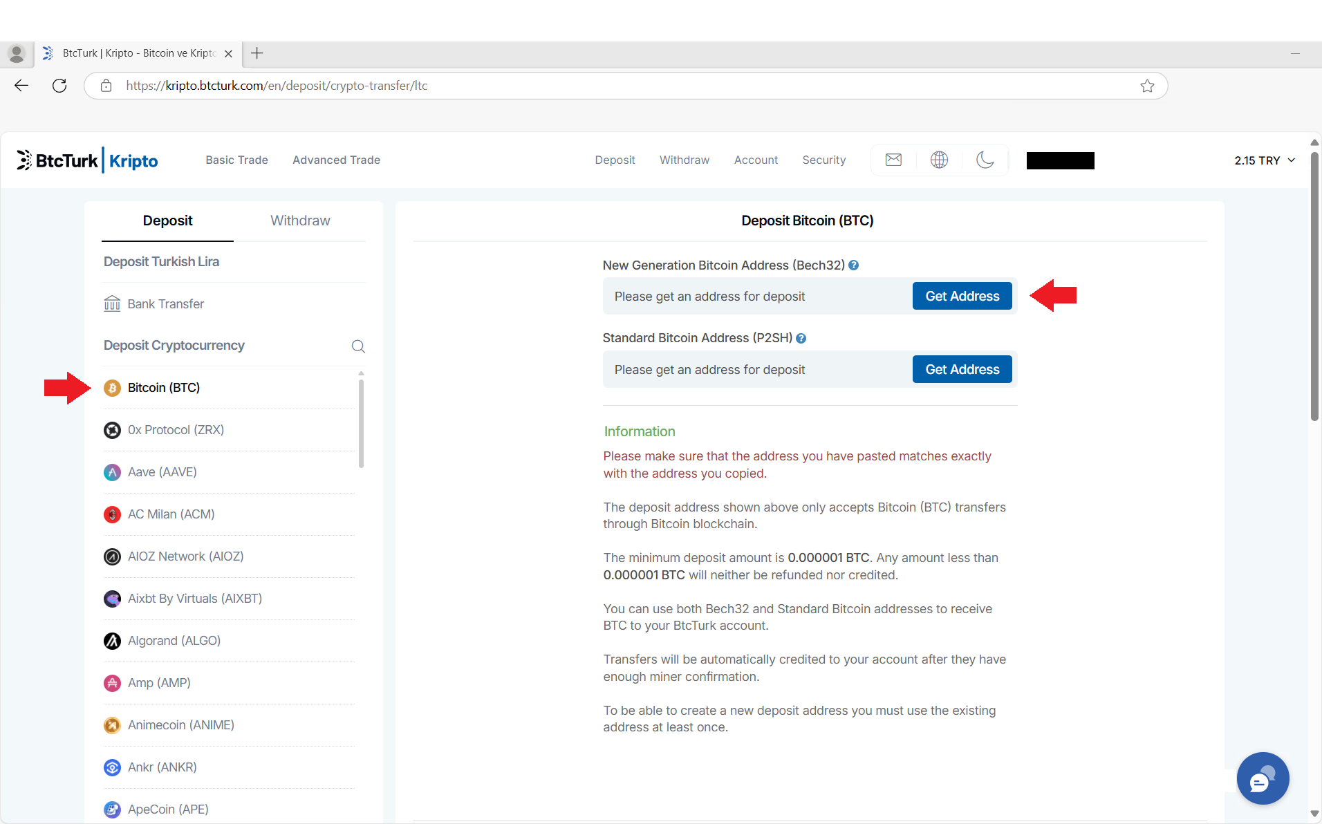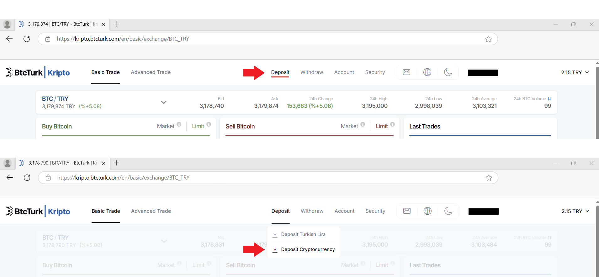 Some exchanges automatically generate these addresses when the user signs up, while others generate them only upon the user’s request. BtcTurk creates a bitcoin address upon request. To obtain a bitcoin address from BtcTurk, open the exchange’s crypto deposit screen (Images-1,2).