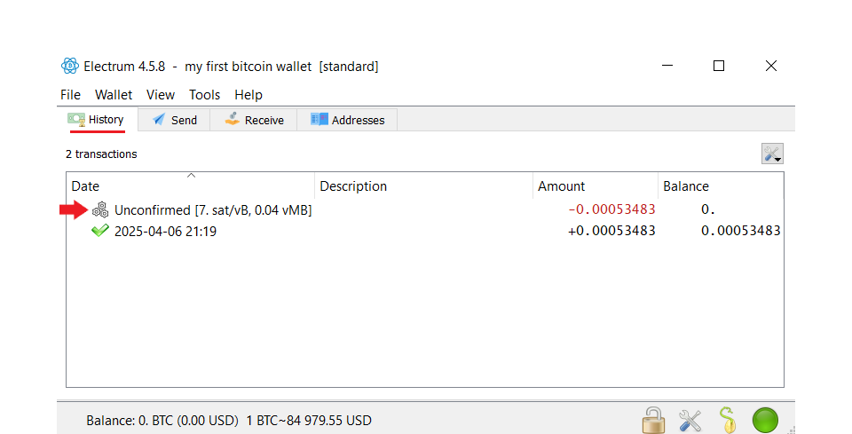 After initiating the transfer, open the “History” tab (Image-8). In this tab, you can see your transaction status. Right after it’s sent to the network, the transaction will show up as unconfirmed.