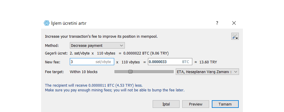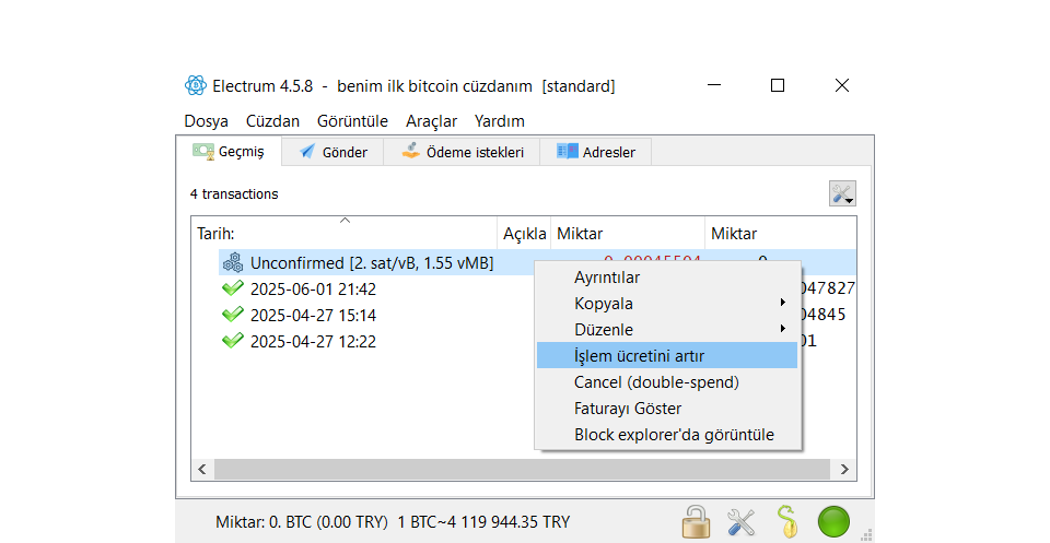 !!! Dikkat: RBF veya iptal özelliğini kullanabilmek için kullandığınız cüzdan uygulamasının bu özellikleri desteklemesi gerekir. Electrum’da bu özellikler mevcuttur. Başka cüzdanlar kullanmanız halinde, bu özelliklerin mevcut olup olmadığını transfer işlemi öncesinde kontrol etmeniz gerekir.