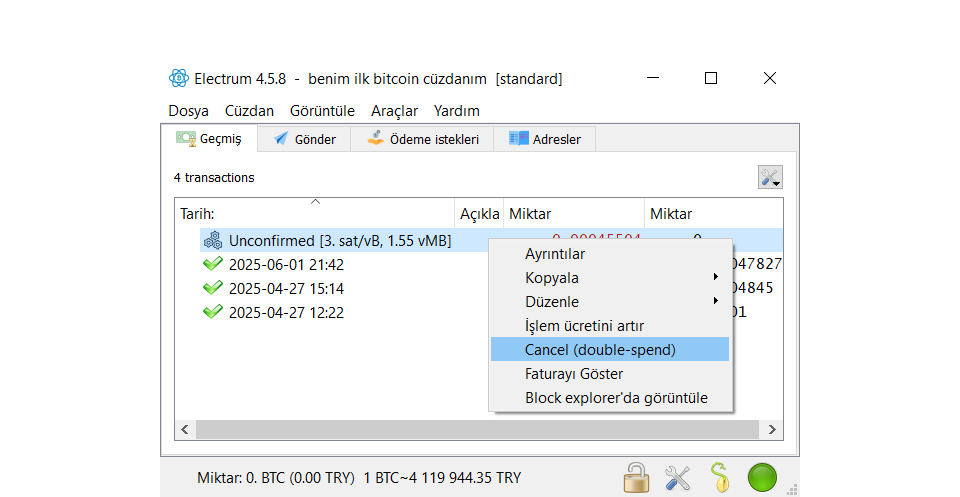 - “Cancel (double-spend)” seçeneğine tıklayın.