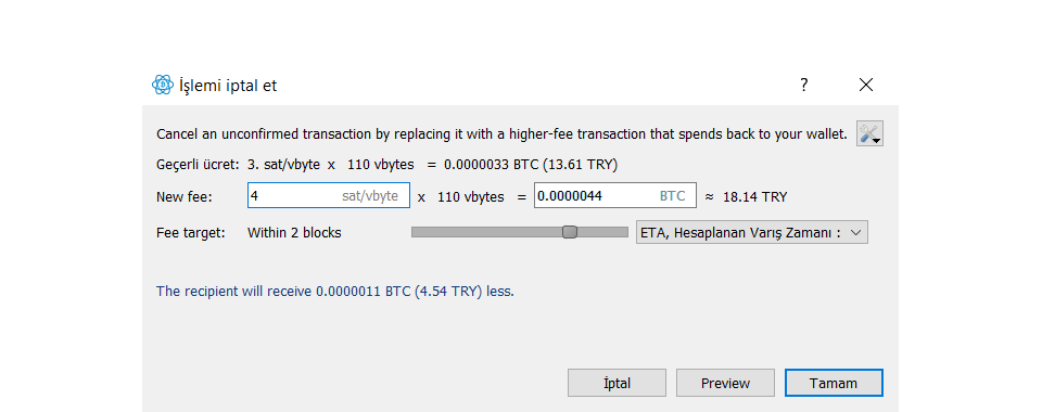 Örneğin: Electrum’da bir transfer oluşturup en düşük komisyonla gönderdiğinizi varsayalım. Transferi oluşturup ağda yayınladıktan sonra iki saat geçti ve transfer isteği hâlâ onaylanmadı. Bu durumda iki seçeneğiniz vardır: ya komisyonu artırmak ya da transferi iptal etmek.