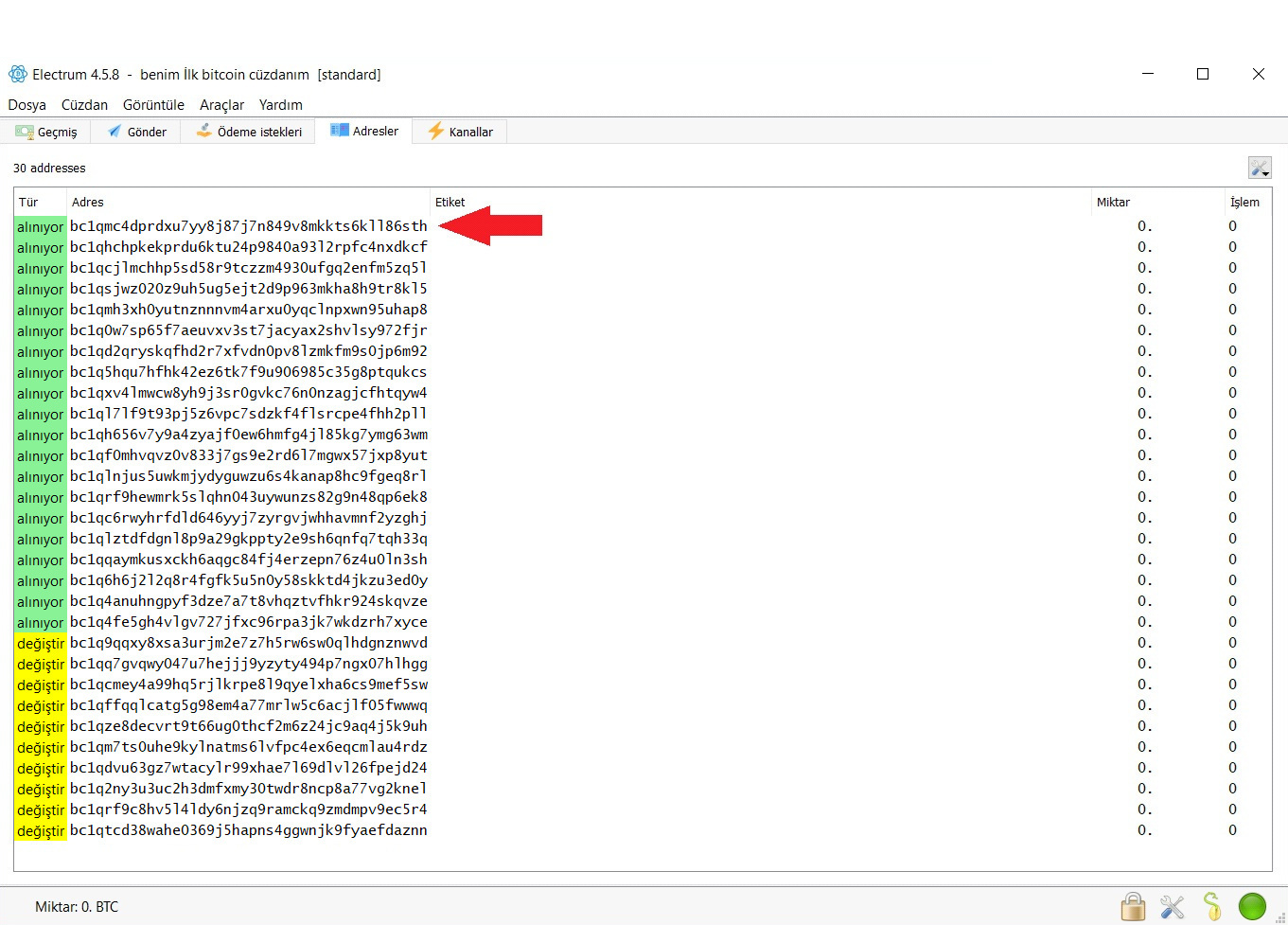 Bitcoin adresinizi görmek için “Adresler” sekmesini açmanız yeterlidir (Görsel-12). Electrum, gizli kelimeleri kullanarak 30 tane adres üretmektedir. Yeni başlayanlar ve uzun vadeli bitcoin biriktirecek olanlar için sadece bir tane adresi kullanmak yeterlidir. Çünkü tecrübeli değilseniz birden fazla adresi kullanmanız bitcoinlerinizi takip etmenizi zorlaştırır. İlk sıradakini kullanabilirsiniz.