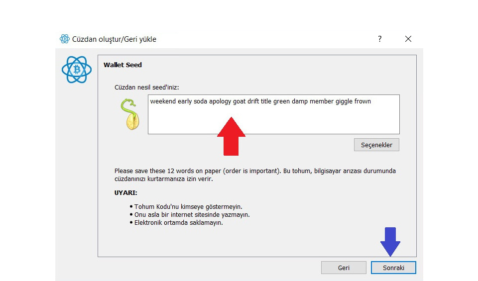 Not: Örnek olarak gösterdiğim ekran görüntüsündeki gizli kelimeleri asla kullanmayın! Eğer bu kelimeleri kullanırsanız, bu yazıyı okuyan başkaları da bu kelimeleri bildiği için cüzdanınızı ele geçirip bitcoinlerinizi çalabilir.